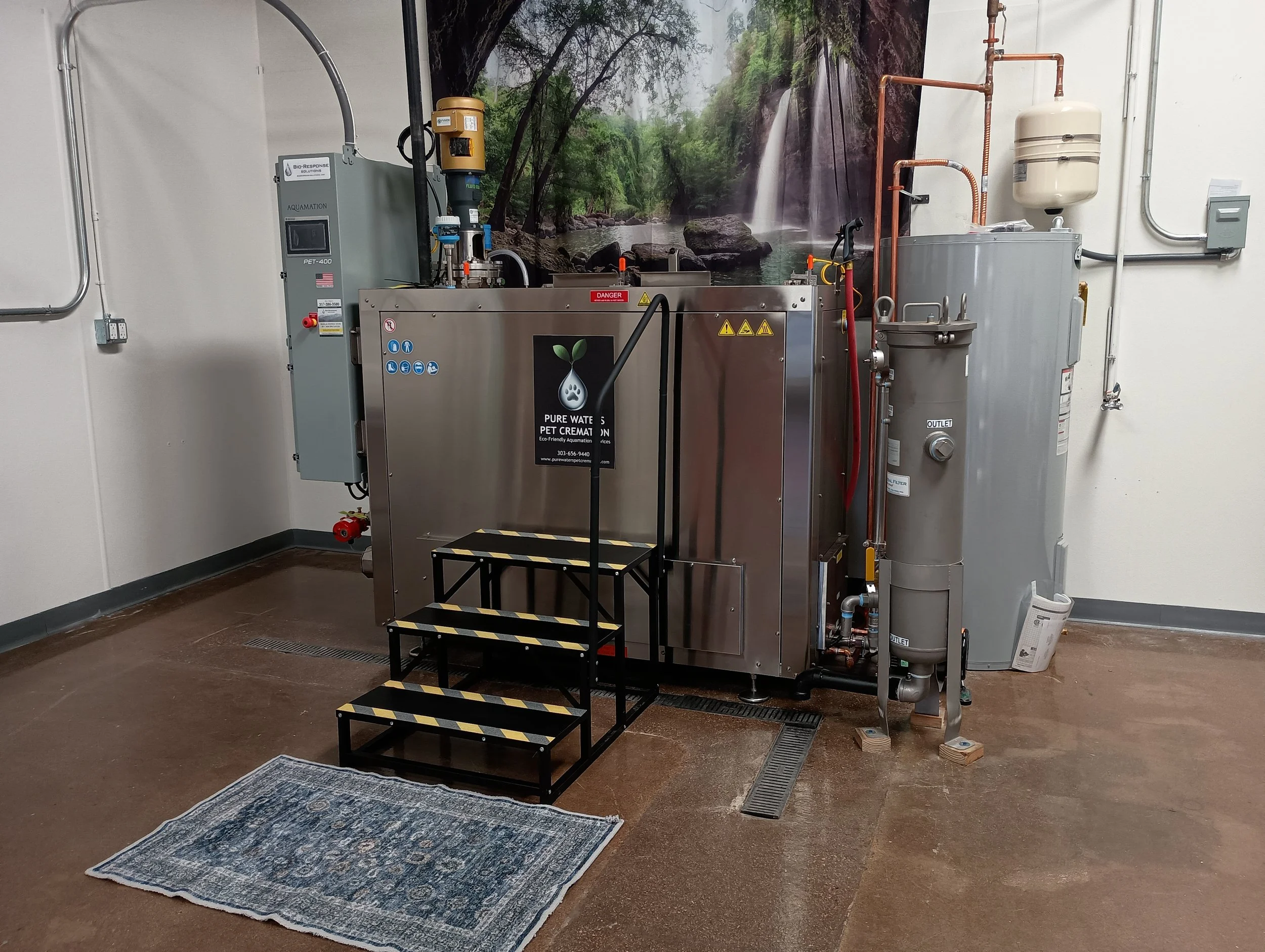 Our Aquamation unit, made in Danville, IN by Bio-Response Systems, can hold up to 400 pounds and can be divided into individual compartments, ensuring each pet is Aquamated separately. It is a low-pressure system and takes about 20-23 hours per cycle.